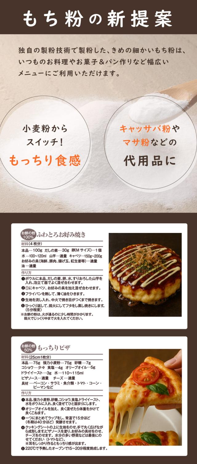 国産もち米を使用しています。いつもの粉もの料理に混ぜて、もちっと食感でアクセントをつけます。