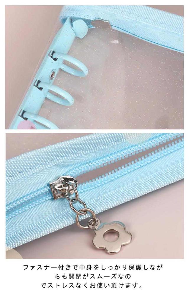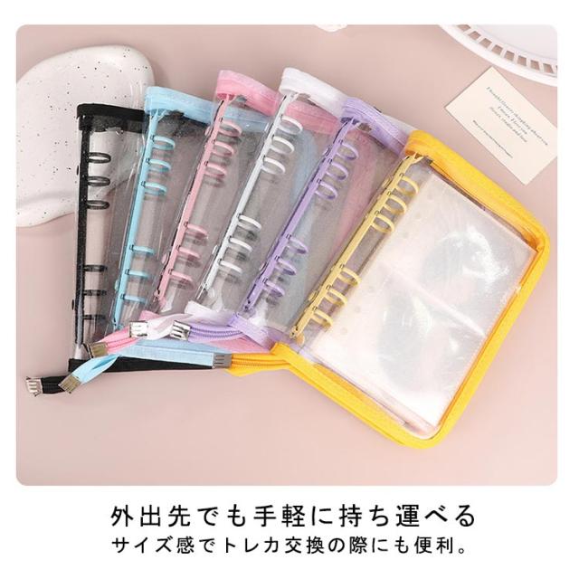 | ファスナー付きの透明シール帳 【リフィル20枚付き】 ファスナー付きで中身をしっかり保護しながらも開閉がスムーズなのでストレスなくお使い頂けます。 6穴式でリフィルの入れ替えも簡単、自分好みにカスタマイズ。 中身がよく見える透明カバーなので、収納したシールや写真、缶バッジを見せることができます。 外出先でも手軽に持ち運べるサイズ感でトレカ交換の際にも便利。 | |