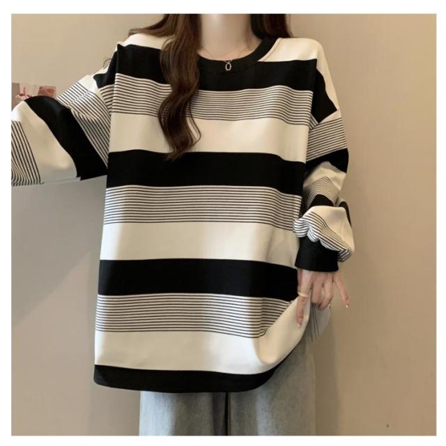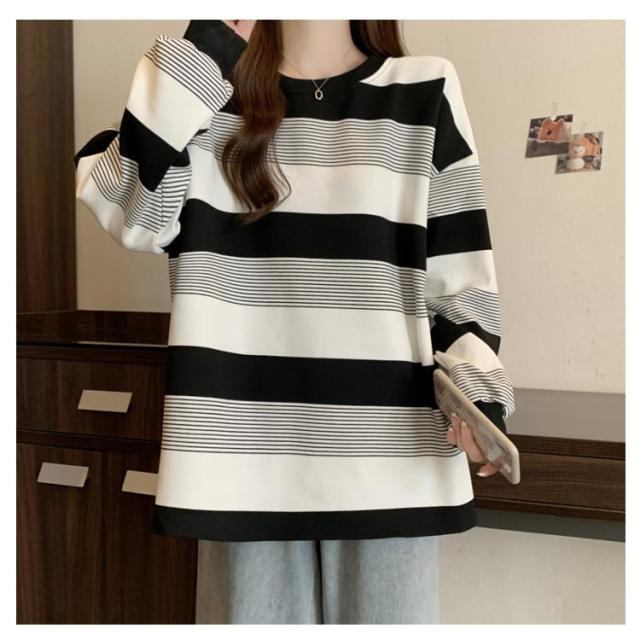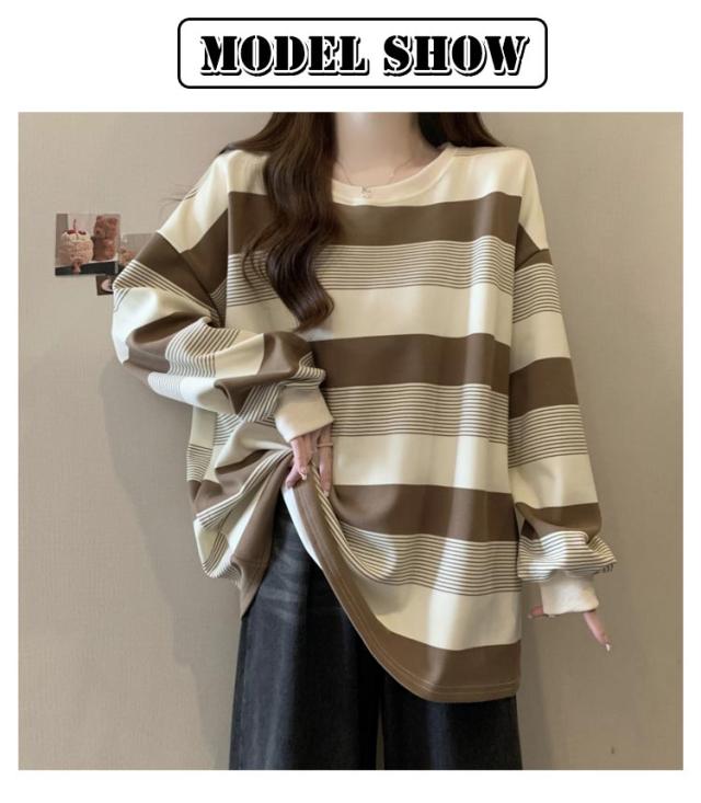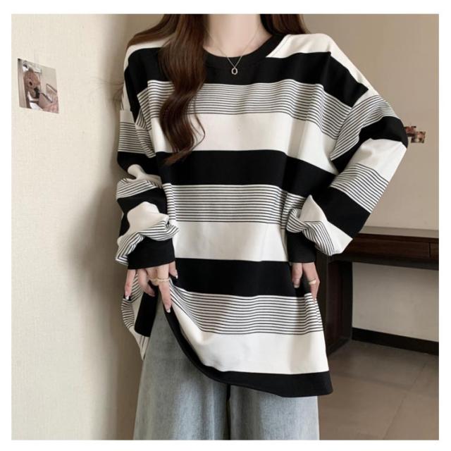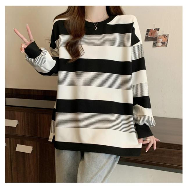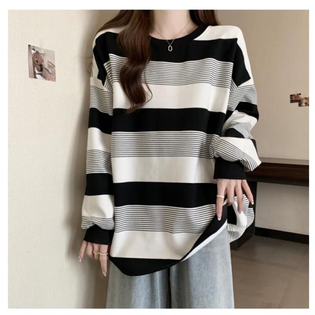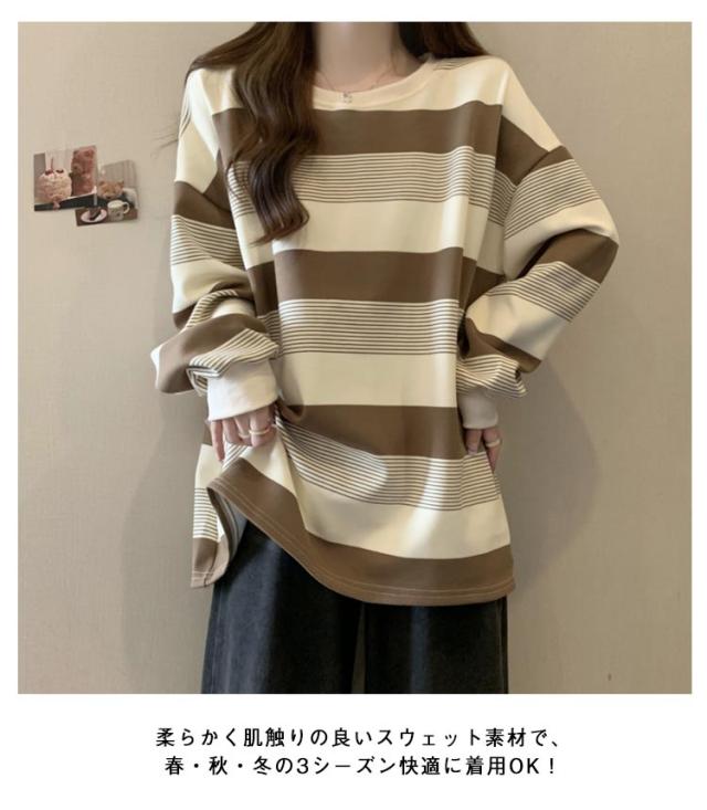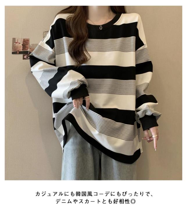 | ゆったりシルエットが可愛い♪ レディース用ボーダートレーナーです。 柔らかく肌触りの良いスウェット素材で、春・秋・冬の3シーズン快適に着用OK! ボーダー柄のデザインが印象的で、モダンとクラシックな雰囲気のバランスが絶妙。 クルーネックデザインで首元すっきり、体型カバーも叶うオーバーサイズ仕様。 カジュアルにも韓国風コーデにもぴったりで、デニムやスカートとも好相性◎ | |