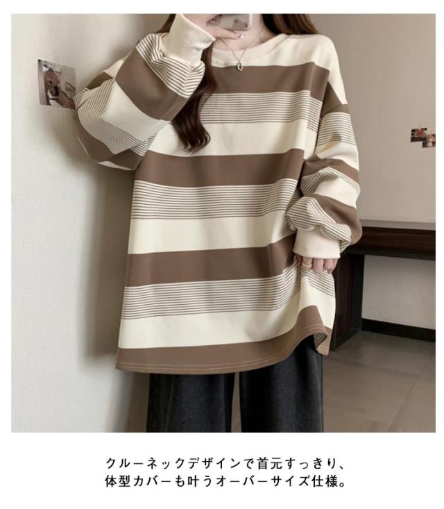 ロングTシャツ トレーナー 長袖 トレーナー ゆったり パーカー クールネック ボーダー プルオーバー オーバーサイズ トップス お洒落 大きいサイズ 体型カバー 通勤 レディース 普段着 春 秋 冬 可愛い 韓国風