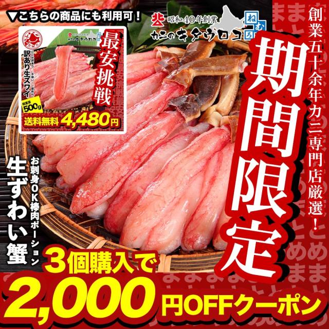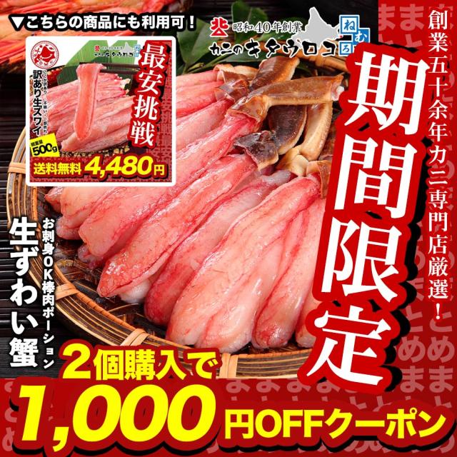 - 発注後すぐに到着、敏速な対応ありがとうございました。 早速カニしゃぶで頂きました。 ちょうど割引きをしていたのでお値段以上! 殻無しで食べやすく、甘みもありとても美味しかったです。