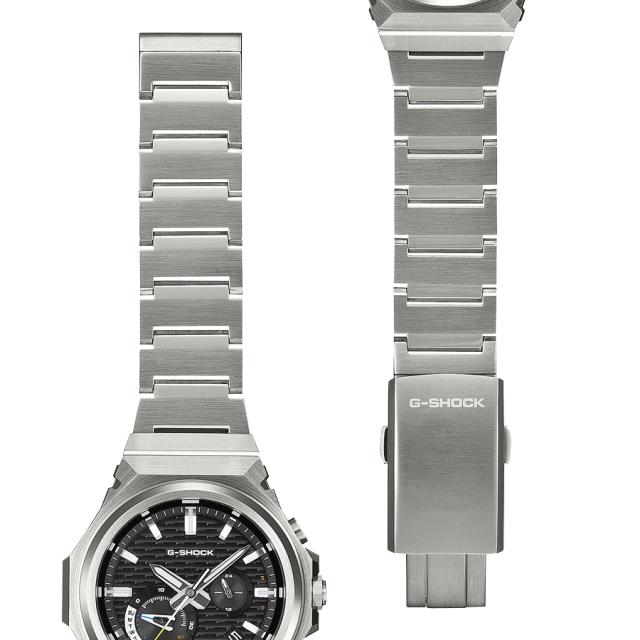 ロゴを排してクリーンな印象に仕上げたベゼルは、縦のヘアライン、円系のヘアライン、ミラー 仕上げの3種で磨き分けられ、光の角度で表情を変え、豊かな質感を演出します。GST-B1000のために開発されたステンレススチール製のバンドには、ヘアライン仕上げとミラー仕上げを施しています。新開発の三つ折れ式中留は、端正なデザインとホールドが魅力。控えめな佇まいが、腕元に上質な空気を纏います。