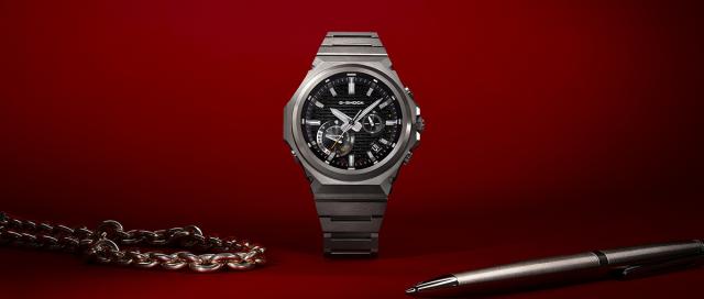 G-SHOCK初号機“DW-5000C”から継承したベゼルデザインやレンガパターンが、ドレッシーな装いの中にスポーティさを加えています。GST-B1000D-1AJFには、同じく初号機から継承した、挑戦する情熱を意味するレッド、防水性を表すブルー、ショックレジスタントを意味するイエローをアクセントカラーに採用。