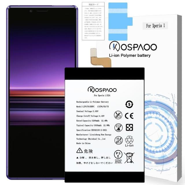KOSPAOO for Sony Xperia 1 バッテリー 第1世代 互換 容量3200mAh 3.85V LIP1701ERPC電池 PSE認証 適用802SO/J8110/J8170/J9110/SO-03L/SOV40等機種 交換修理用 Rechargeable Li-Polymer Battery 高温・低温耐性 600〜800サイクル寿命 適用Xperia 1電池【No Tool】