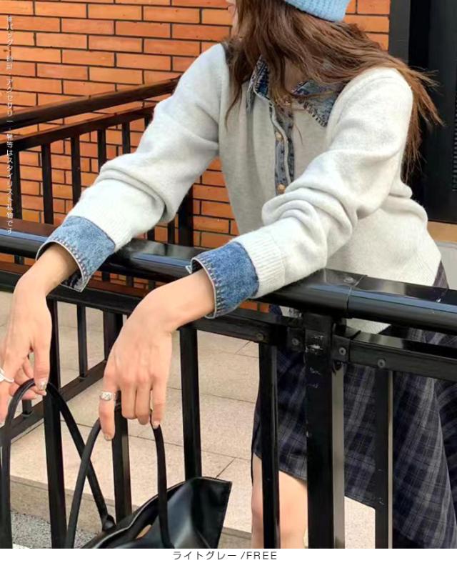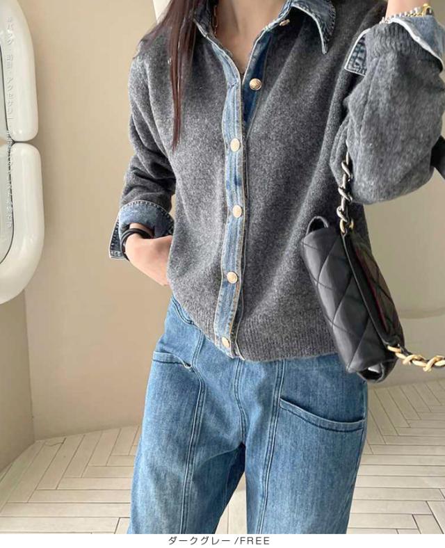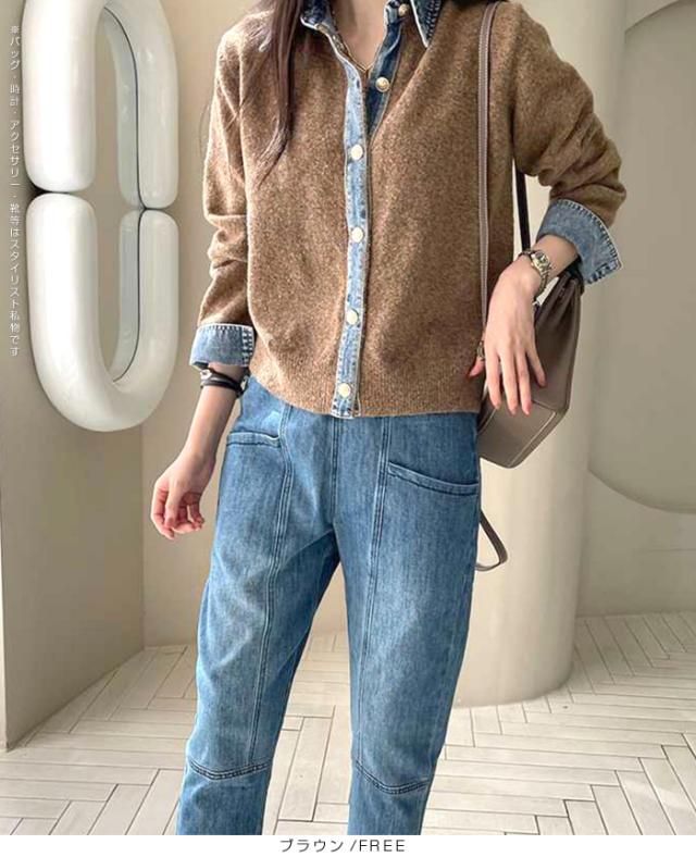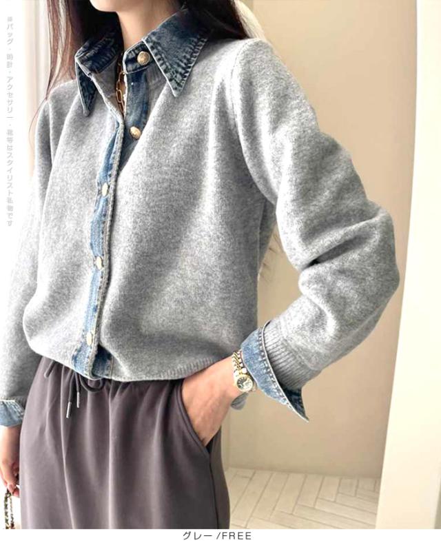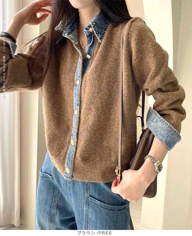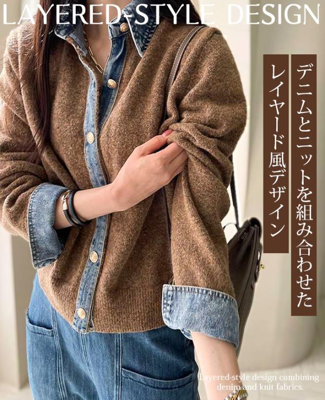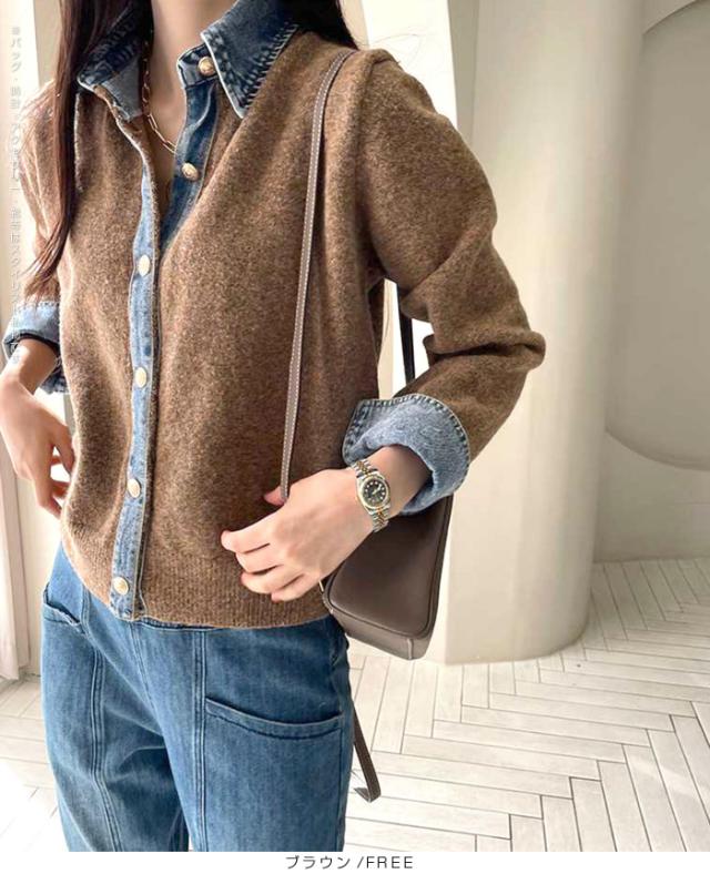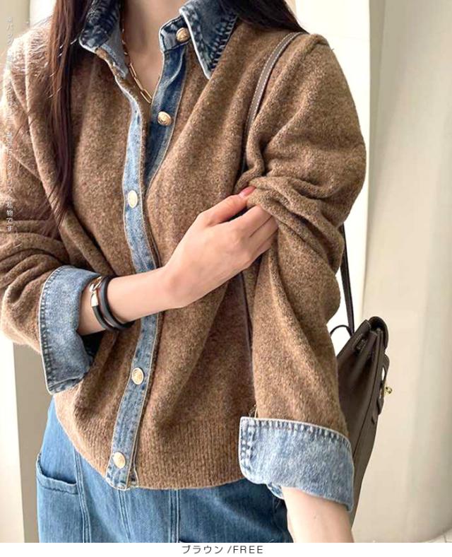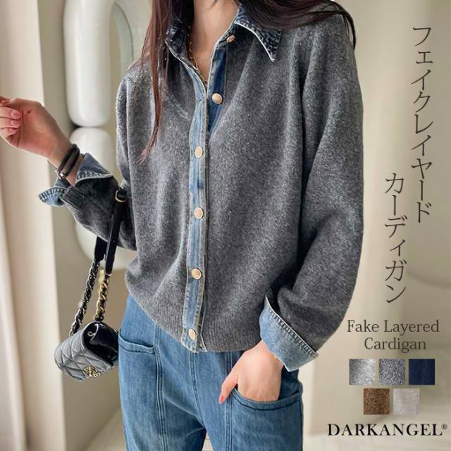 40%OFFクーポン!トップス カーディガン レディース 秋 冬 カーデ 異素材 フェイク レイヤード 重ね着 重ね着風 着回し デニム カジュアル ブラウン グレー FREE【フェイクレイヤードカーディガン】ダークエンジェル