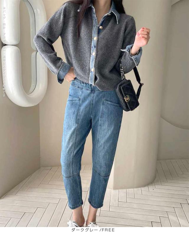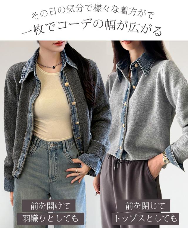 デニムとニットを組み合わせたレイヤード風デザインが目を惹く、