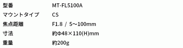 MT-FL5100Aは、5〜100mmまで広角から超望遠距離の変更が可能な、DCタイプのオートアイリスレンズです。