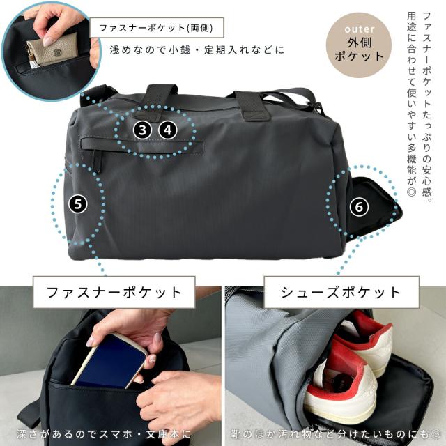 スポーツやゴルフにも便利なシューズポケット付き!メイン収納には乾湿分離ファスナーポケットでタオルや折りたたみ傘など、濡れ物も安心。
