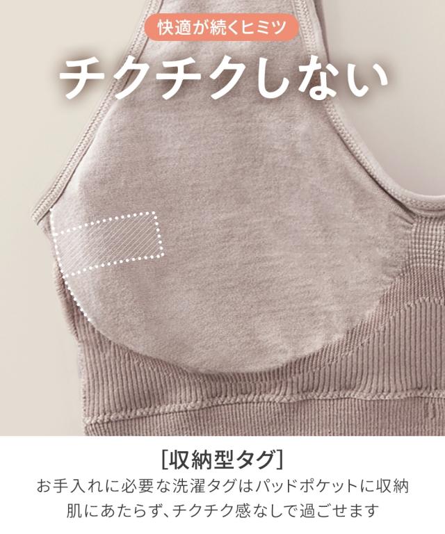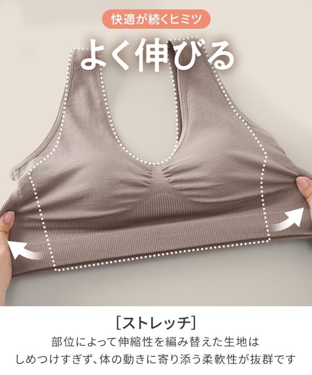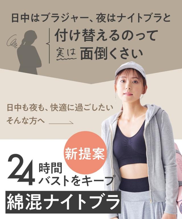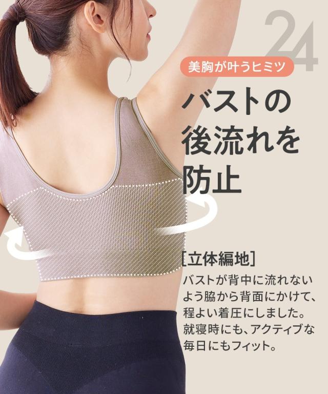 n,for24は24時間使える快適なインナーシリーズです。 「いつでも着られるストレッチナイトブラジャー(綿混素材)」は伸びがよくフィットする成形編みで作られています。 バストシルエットをキープし、脇や背中もすっきり。 就寝時や日中ずっと過ごせるように素材にもこだわり、綿混素材で風合い柔らか、肌にふんわり優しいです。 【おすすめポイント】 ・綿混素材で肌触りが柔らかく、1日中快適つけることができます。 ・フィットする成形編みで作られており、必要な部分だけきゅっと引き締め、快適に過ごせます。 ・タンクトップ型で肩ひもも柔らかく負担がかかりにくいです。 ・下から履くタイプで着脱も楽々です。 【こんな方におすすめ】 ・締め付けがイヤ ・ワイヤーが痛い ・ストラップで肩が痛い ・寝るときのバストケアが気になってきた ・日中のバストシルエットはキレイでいたい ・脇・背中のぶよぶよ肉が気になってきた 【商品特徴】 ・日中のアクティブなシーンでも動きについてくる伸びの良い成形編み仕様 ・就寝時のバストの広がりを防ぐ設計 ・一日中快適な肌当たりの柔らかい素材、成形編み仕様 ・ずっと使いやすいシンプルなデザイン、カラー