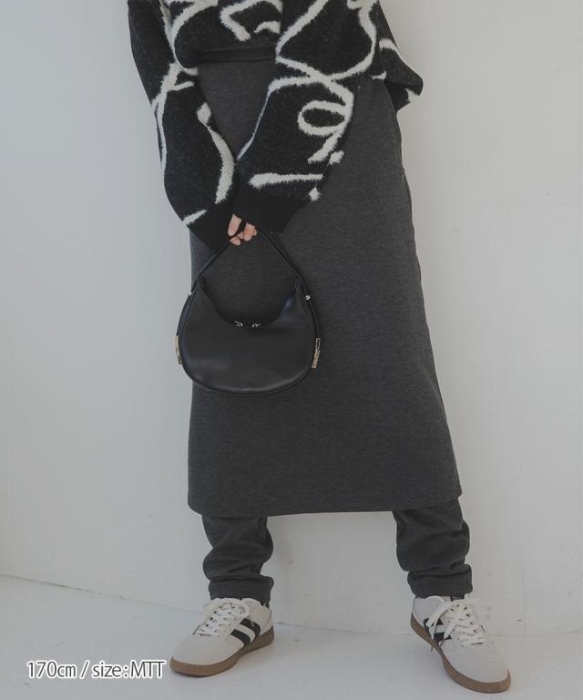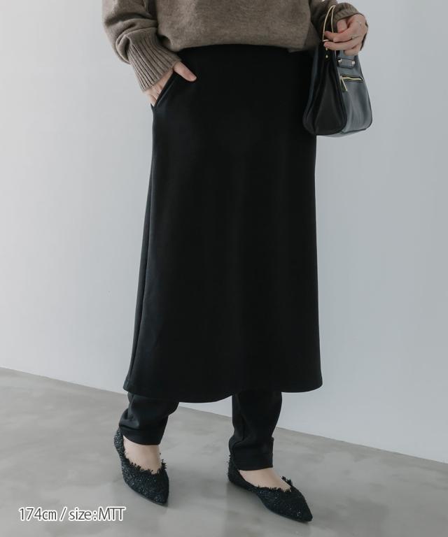 スカートとパンツがドッキングされた、技ありデザインのレイヤードボトム。Iラインのミディ丈スカートと、細身のパンツ(レギンス)が一体化しており、忙しい朝でも迷わずおしゃれな重ね着スタイルが完成します。後ろに入ったスリットが抜け感を演出し、足さばきも快適。ウエストは総ゴム仕様で、リラックス感のある履き心地です。