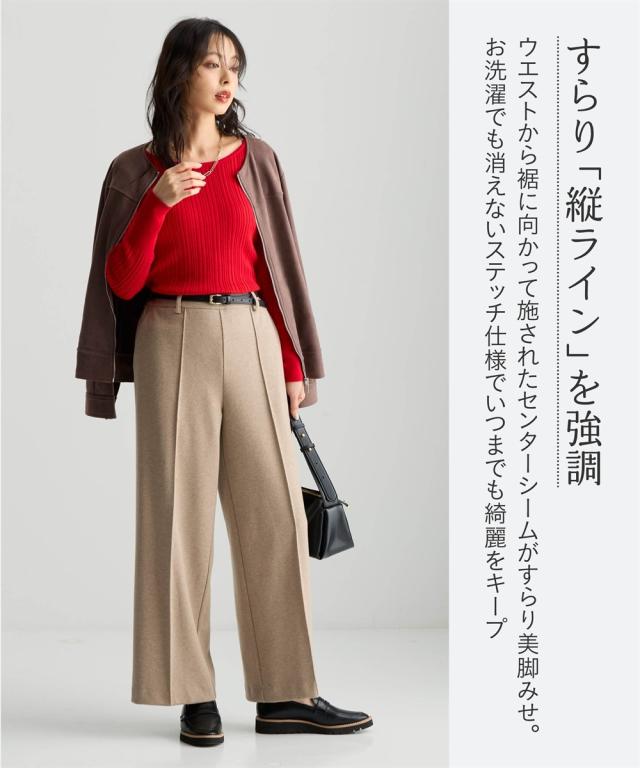 美脚見えを叶える最大のポイントは、ウエストから裾へとまっすぐに入ったセンターシーム。洗濯しても消えずにきれいなラインを保てるのも嬉しいポイント。縦のラインを強調することで、脚を長く、まっすぐに見せてくれます。