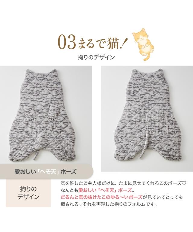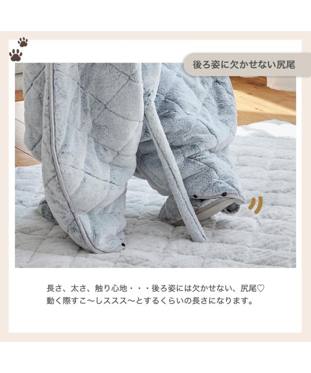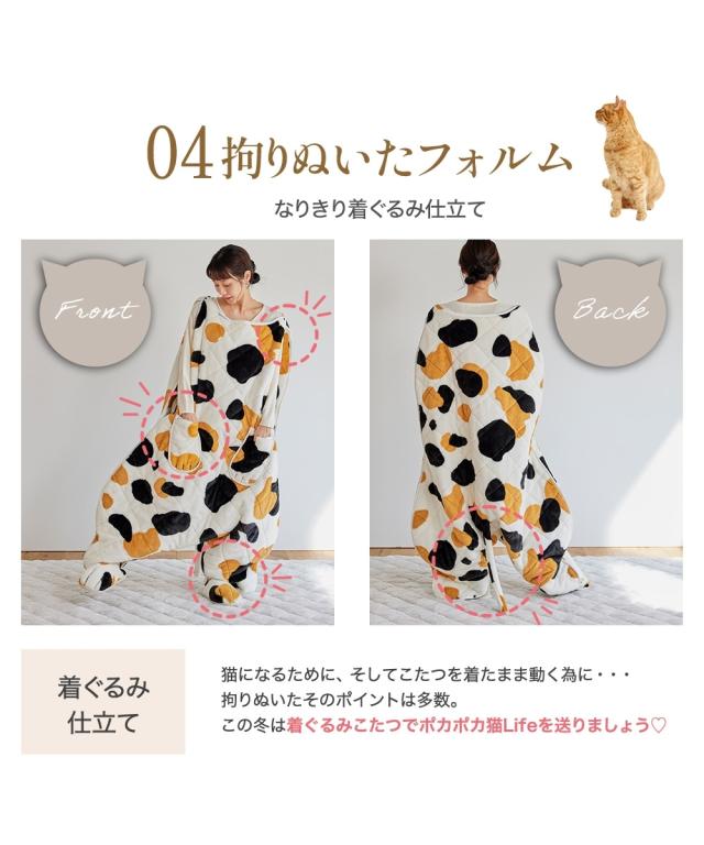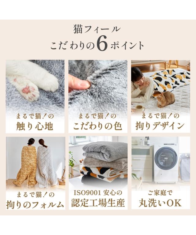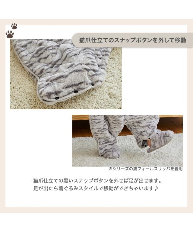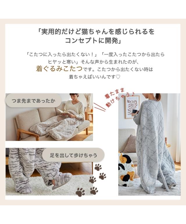 ■商品特徴:まるで猫のような肌ざわりの猫Feelシリーズから、着ぐるみこたつが誕生。 猫はこたつに入るとなかなか出てこない。。。あの至福を人間が“着て”持ち運べたら暖かそう という妄想が膨らみ、形になった商品です。 あたたかさはもちろんのこと、フォルムにこだわり、うしろ姿はしっぽとぽてっとした姿がなんとも愛おしい そんな着ぐるみこたつです。 こたつに入ると出たくないな〜だったら、着ちゃえばいいんです。 この冬猫Feelの着ぐるみこたつでぬくぬく快適生活を送りませんか。 ●おすすめポイント:色・品質・毛足・肌触り・暖かさのこだわり、まるで猫のような”とろとろ”手触り感 ・猫独特のまだらで毛先が白い地肌の雰囲気を出すためにバックプリントを採用。 基布に色を付ける事で、表からは毛先は白く地の部分にしっかりと色を付ける事で優しい雰囲気を再現しています。 ・色の付け方、毛足の長さ、毛の細さを細部まで確認を重ねこの肌ざわりが実現しました。 ・毛の長さは約9mmと毛布の中では長めの毛の長さになります。 少し長めの毛足はまるで猫の足部分の毛の長さと似ていて、何度も触りたくなるような気持ち良さです。 ・糸は75デニールと大変細い糸を使用しております。
