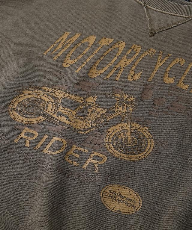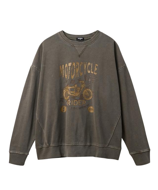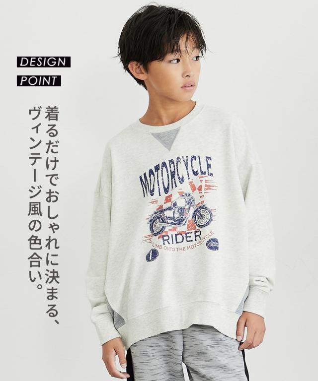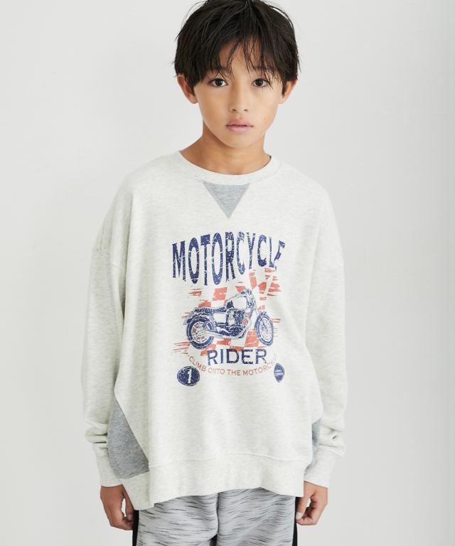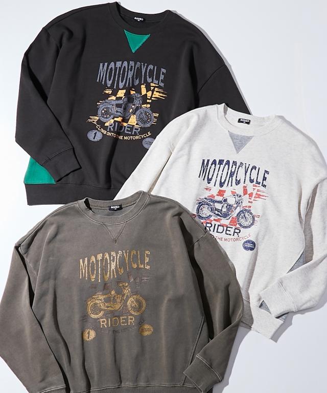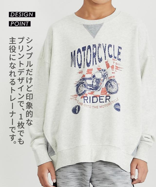 ・ フロントに大きくプリントされた「MOTORCYCLE RIDER」のロゴとバイクのイラストが、クールでかっこいい印象を与えます。