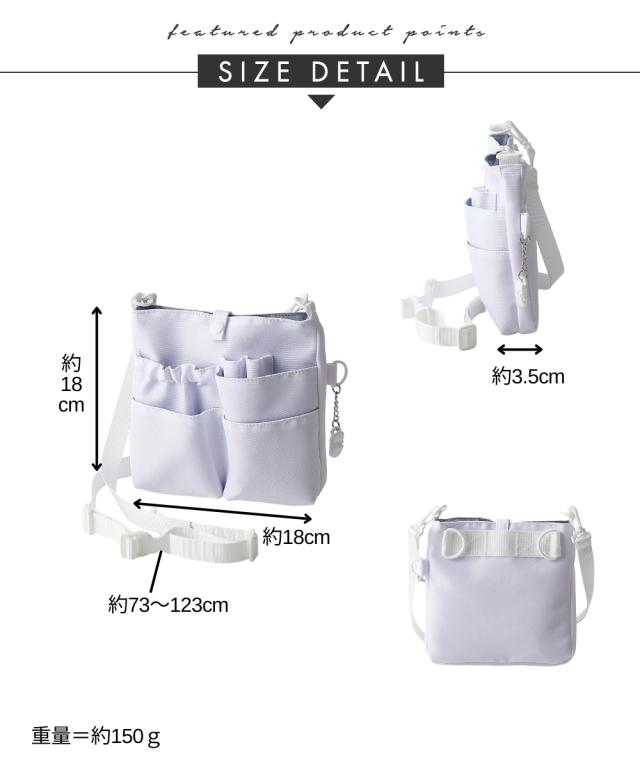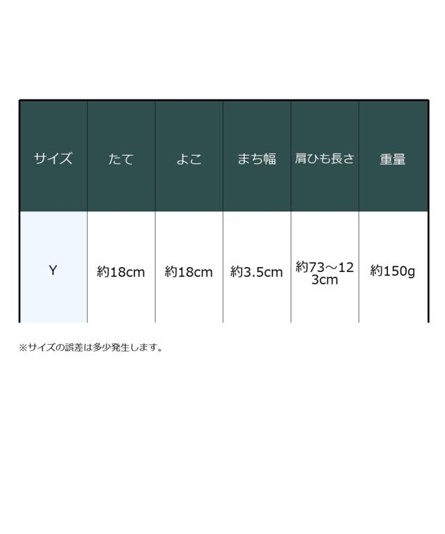 材質=ポリエステル サイズ=たて約18×よこ約18×まち幅約3.5cm 開閉=ホック ポケット=中:2個(オープン1、ファスナー1)外:6個(オープン4、ペン入れ2) 肩ひも長さ=約73〜123cm 調整可 取り外し可 重量=約120g 備考付属:チェーン付きクリップ1・背面ウエストバッグ用のDプラステック付き 原産国:中国製 備考:※サイズの誤差は多少発生します。
