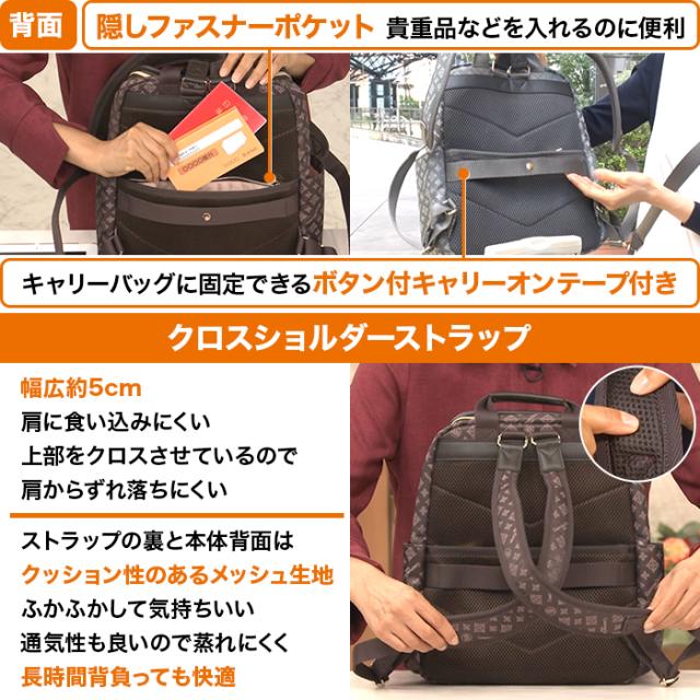本体背面側:段ファスナーポケット×1、ボタン付キャリーオンテープ、サイド:マチ付オープンポケット×2