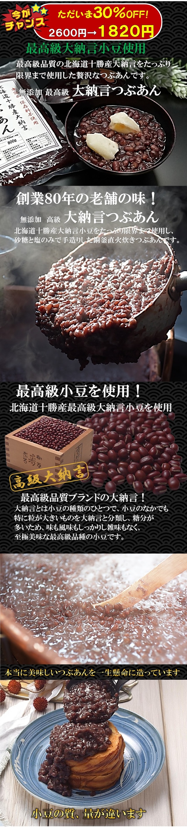 北海道十勝産小豆「大納言」を使用した高級大納言つぶあん800g、送料無料でお届けします。
