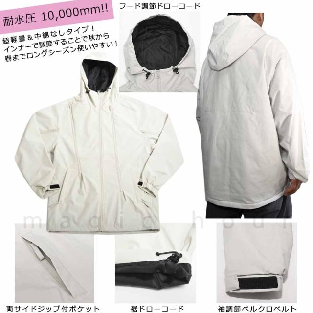 軽量・はっ水・防風・防水・透湿仕様!耐水圧10000mmの耐久素材を使用したスノーボードウェア! 中綿無し+裏地付きタイプでインナーで調節しやすく秋から春までロングシーズン使いやすい! 疲れにくく、注目のゆったりめシルエットで快適♪フード調節機能や袖口ベルクロベルト、両サイドジップ付きポケット、スポーツ時の使用でも動作性◎ インナーで調節しやすいので普段使いや通勤通学にも使いやすい。防汚効果も◎シンプルな無地デザインがコーディネートしやすい! |