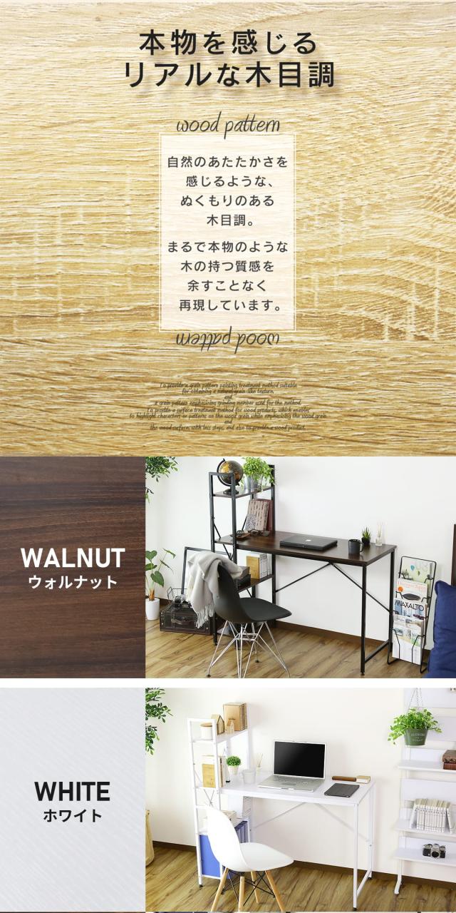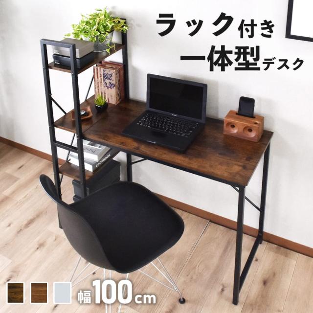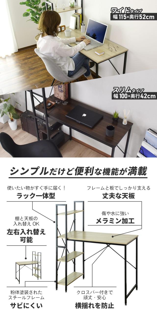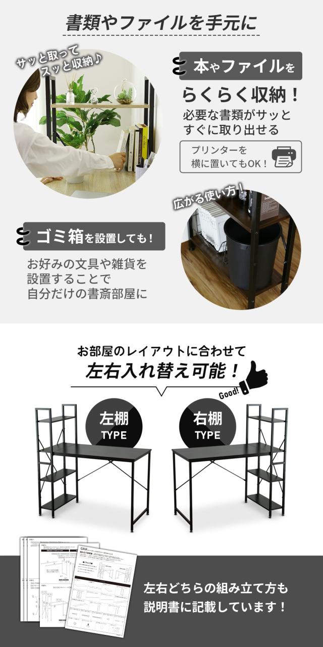 ラック付きで、資料や文房具などよく使うものを手元に置きながら作業スペースをしっかり確保できる便利なデスク。棚は左右どちらにも設置可能で、部屋のレイアウトに合わせて自由に配置できます。