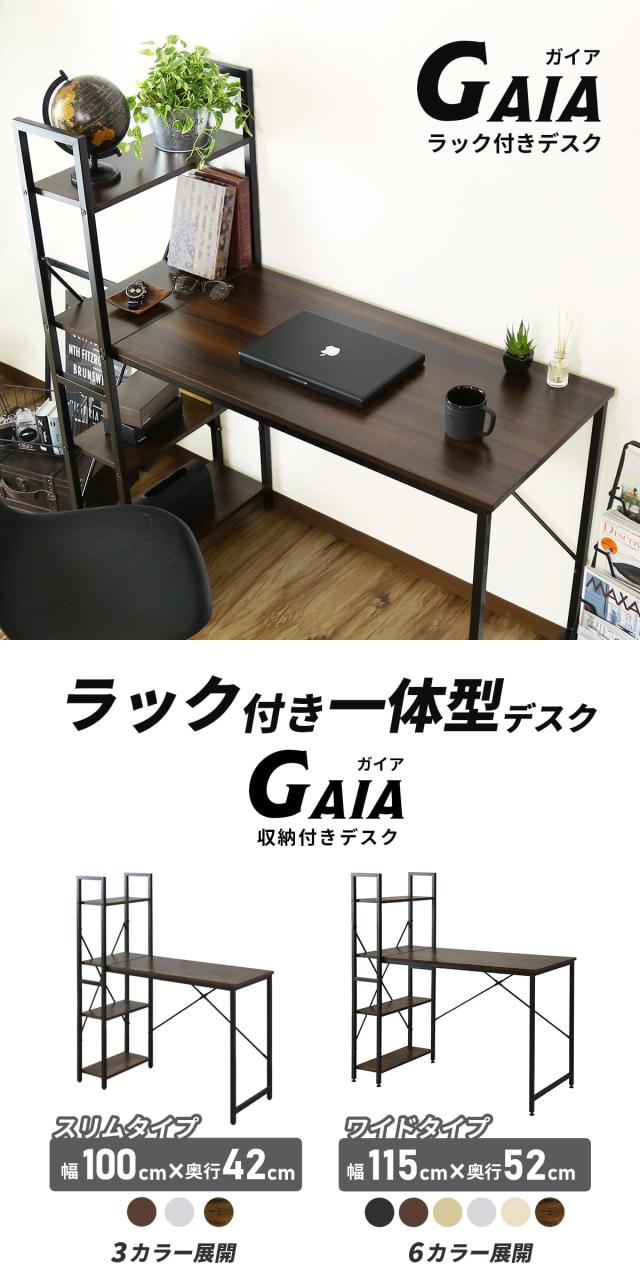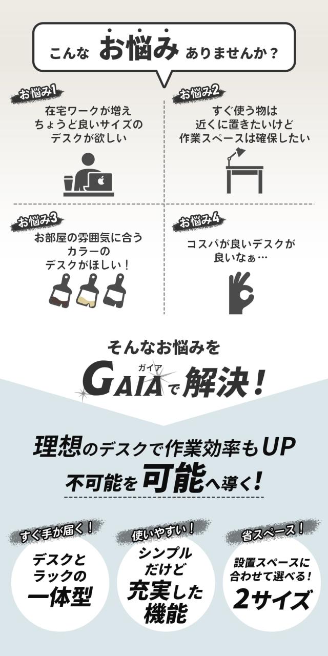 在宅ワークにちょうどいいサイズが欲しい、作業スペースを確保しつつ物も置きたい、部屋に合う色を選びたい、できればコスパも重視したい———そんなお悩みをまるごと解決するのがラック付き一体型デスク「ガイア」です。
