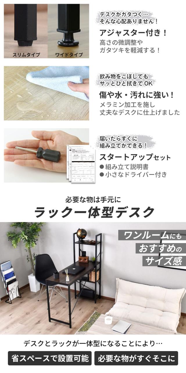 シンプルデザインで省スペースに設置でき、ワンルームにも最適なサイズ感の「ラック付き一体型デスク ガイア」。丈夫なメラミン加工天板、左右入れ替え可能なラック、サビに強いスチールフレーム、クロスバーによる安定設計に加え、アジャスター付きでガタツキもなく、細部までこだわった仕様で快適に使えます。