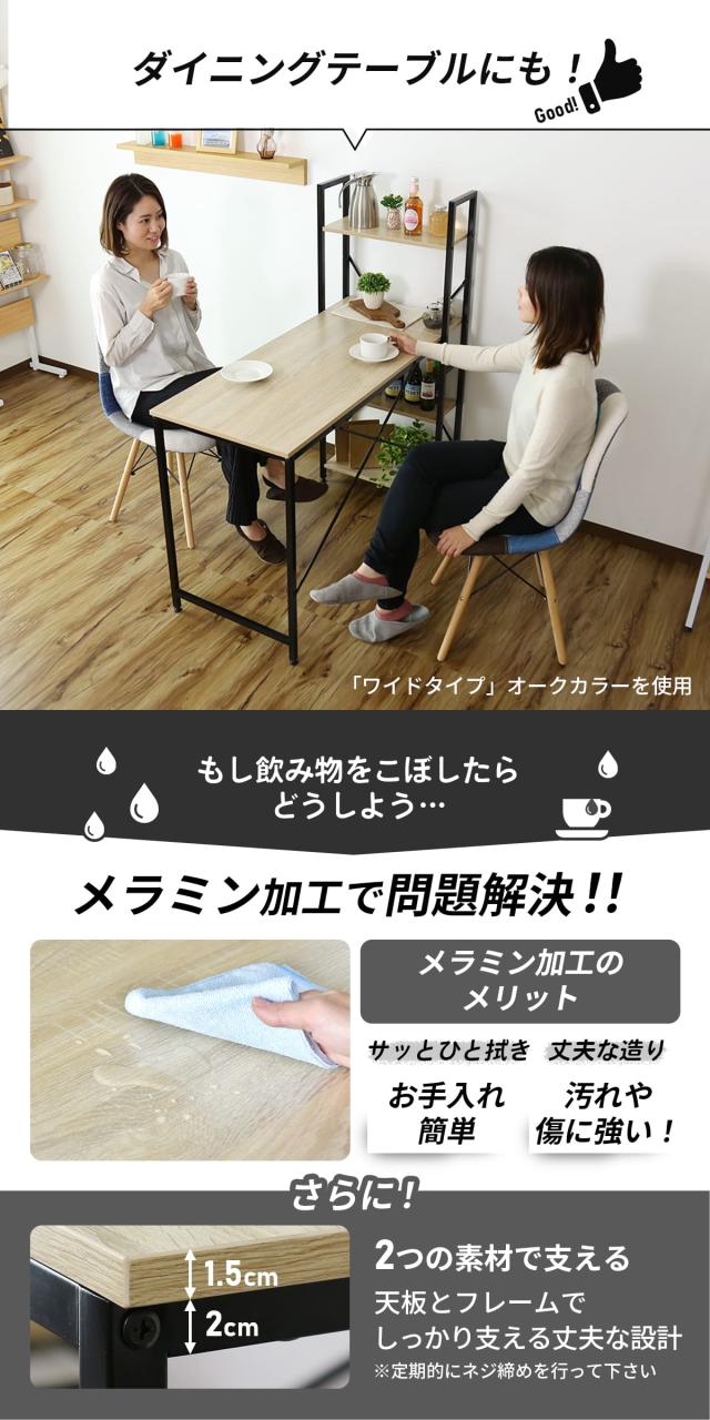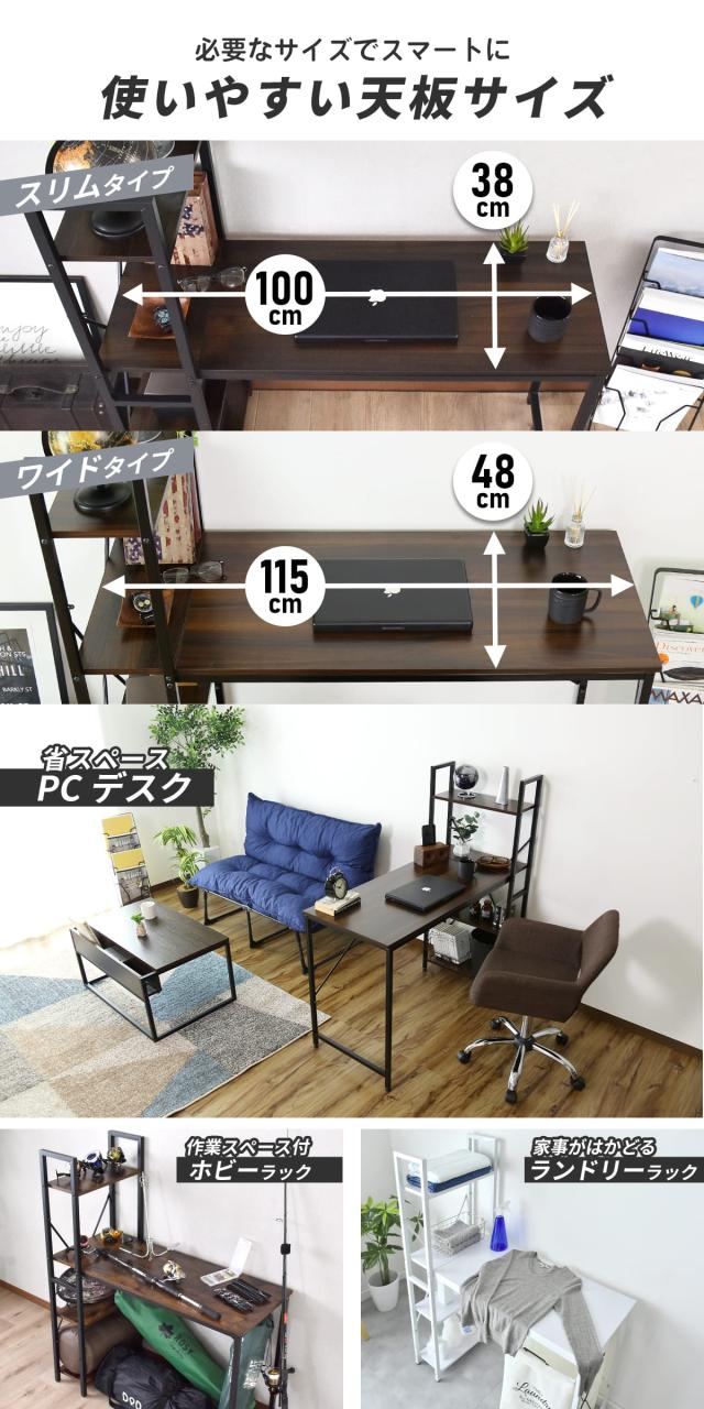 「ガイア」はパソコンデスクとしてはもちろん、ホビーラック、学習机、ランドリーラック、さらにはダイニングテーブルとしても活躍。棚付き構造で収納スペースを確保しながら、限られた空間を有効活用できます。木目調の天板とスチールフレームのシンプルなデザインがどんなインテリアにも馴染み、省スペース家具としても優秀です。
