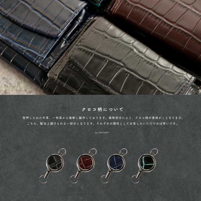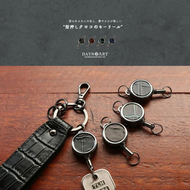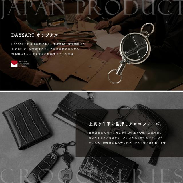 リールコード メンズ 定期入れ IDカードケース 本革 レザー 型押しクロコ リールストラップ キーホルダー 伸びる 30cm ベルトループ 便利 クロコダイル ガンメタ レディース ユニセックス