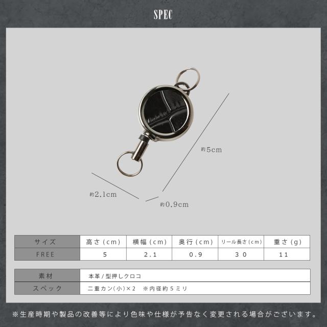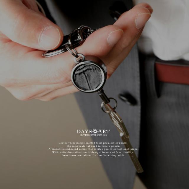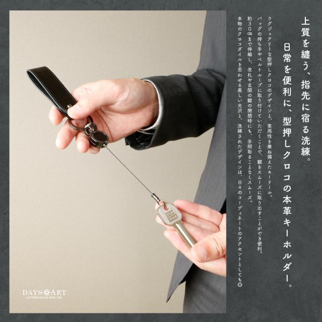 ラグジュアリーな型押しクロコのデザインと、実用性を兼ね備えたキーリールです。バッグの持ち手やベルトループに取り付けることで、鍵をスムーズに取り出すことができます。リールは最大約30cmまで伸縮するので、バッグから取り外す手間なく、改札や玄関の鍵の開閉がスムーズに行えます。