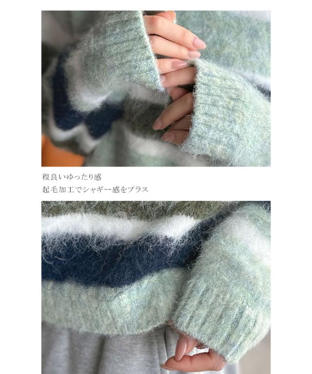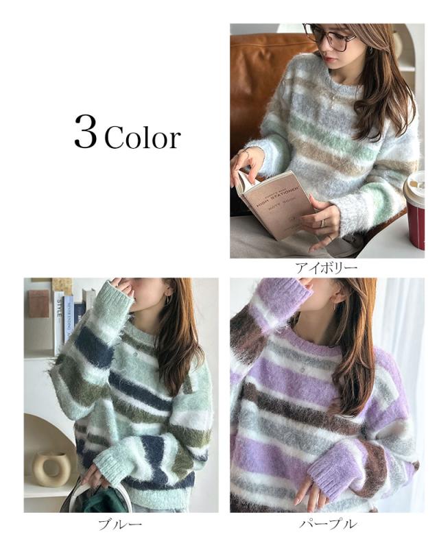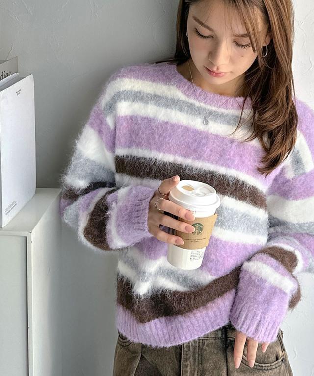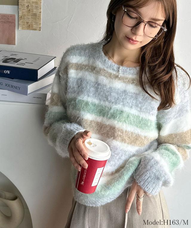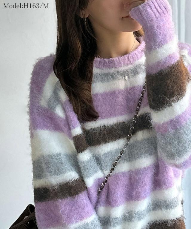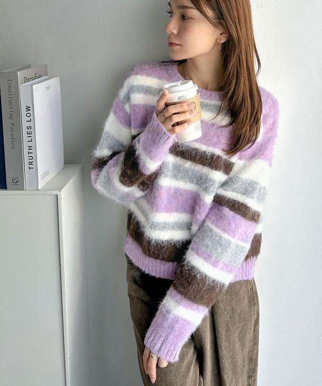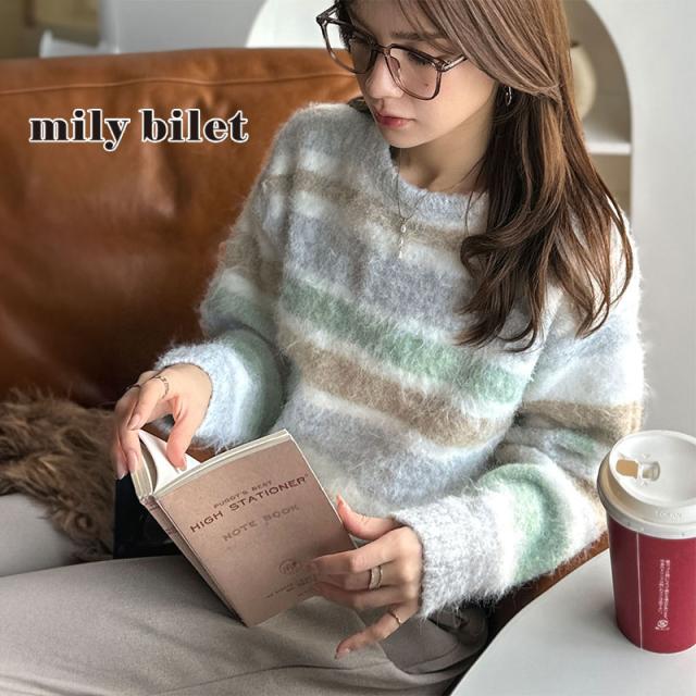 クラシカルエルフ冬新作 mily bilet ニット トップス レディース マルチボーダー シャギー プルオーバー 華やか ミックスカラー ふんわり ストレッチ糸 ゆったり感 リラックス 起毛加工 主役級ニット 可愛い カジュアル 大きいサイズ 2025aw mi1329040