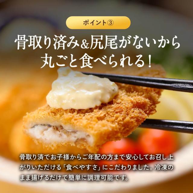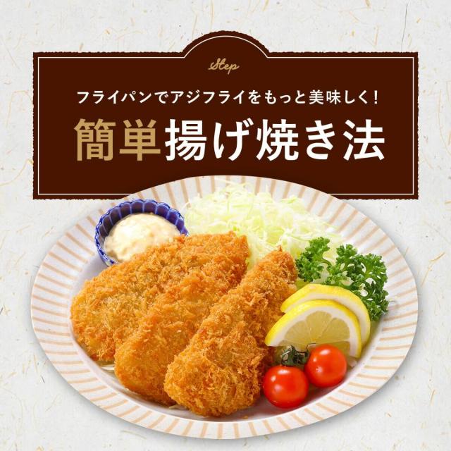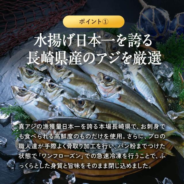 アジフライはスーパーでもよく販売されている、人気のお惣菜です。そんな日本の食卓には欠かせないアジフライですが、お客様とお話していると 「アジフライは好きだけど、食べている時に骨の固い部分が気になる…」 「骨がついていると、子供がなかなか食べてくれない…」 というお声を耳にすることがあります。そんなお悩みをお持ちのお客様に、今回は当店の「骨取り済 サクッ!ふわっ♪絶品アジフライ」をご紹介します!当店のアジフライは、マアジの漁獲量日本一を誇る本場長崎県で、お刺身でも食べられる高鮮度の原料だけを使用しています。さらに、プロの職人達が手際よく骨取り加工を行い、パン粉までつけた状態で「ワンフローズン」での急速冷凍を行うことで、新鮮なアジのふっくらとした身質と旨味をそのまま閉じ込めました。また衣にもこだわり、「粗めのパン粉」で「薄い衣」をつけることで、「サクッ」としたキレの良い食感と、「ふわっ」とした優しい食感の両方を楽しめる、絶品のアジフライに仕上がっています!さらに、骨取り済でお子様からご年配の方まで安心してお召し上がりいただける「食べやすさ」と「食べたい時に」、「食べたい分だけ」、「冷凍のまま揚げるだけ」で食べられる「使いやすさ」にもこだわりました。当店が自身をもってオススメする、「骨取り済 サクッ!ふわっ♪絶品アジフライ」、ぜひご賞味ください!