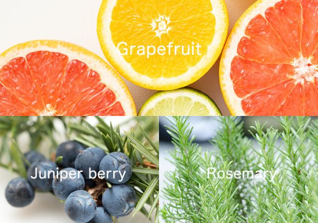 ジューシーで爽やかな「グレープフルーツ」、頭がクリアになるようなフレッシュ感のあるハーブ「ローズマリー」、お酒のジンの香りづけのスパイスとして用いられる爽やかでシャープな森の香り「ジュニパー」(ジュニパーベリー)をバランス良く配合。