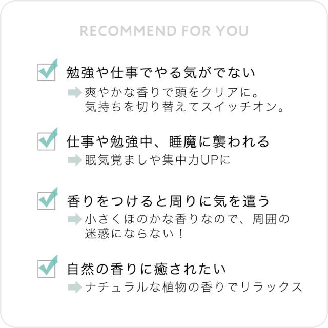 香りを感じたい方は、手首の内側や首筋、耳裏などの香りが立ちやすい場所がおすすめです。頭(眉間やこめかみ)など、体の重さや眠気を感じてスッキリしない部分にもお使いいただけます。