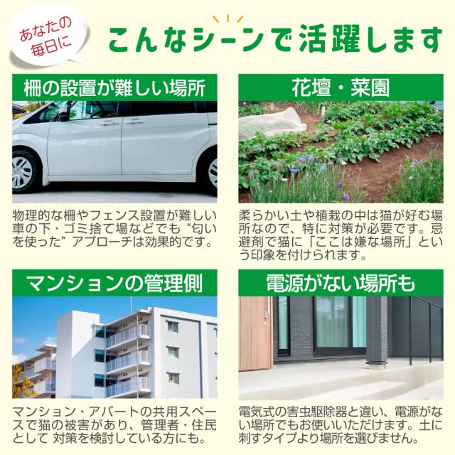 ネコが嫌がる天然植物由来(レモングラスと木タール)のニオイを発する忌避剤です。
