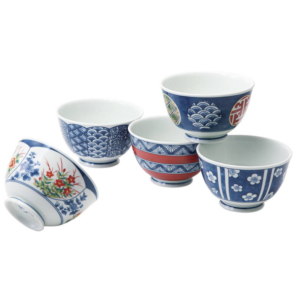 波佐見焼 染錦文様 お好み丼揃 20637 5個、和皿、食洗器可、電子レンジ可、西海陶器、日本製、国産、化粧箱入、送料無料、地紋、色絵、花絵、五文様、小丼、麺類、手軽