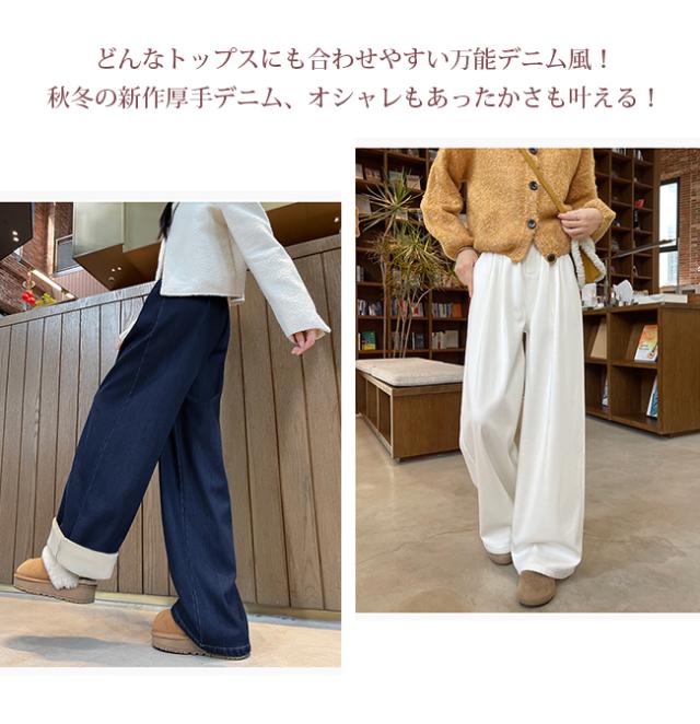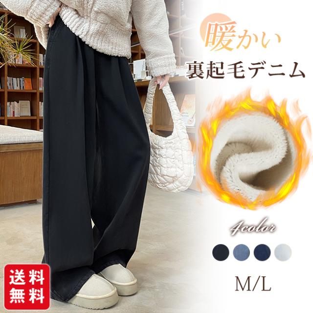 冬新作 裏起毛 デニム 裏ボア ジーンズ ポケット付き パンツ デニムパンツ レディース ワイドパンツ ワイド 体型カバー 脚長効果 動きやすい ジーパン ボトムス ストレート ゆったり ハイウエスト ストレッチ ハイライズ 暖かい 秋 冬