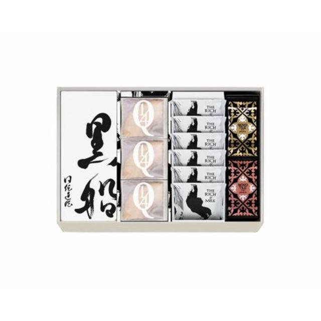 詰合せ内容 黒船カステラ 1本、クアルトバウム 3個、ザ リッチ アンド ミルク 6枚、ノボタイル12枚(ダーク・フレイズ 各6枚)
