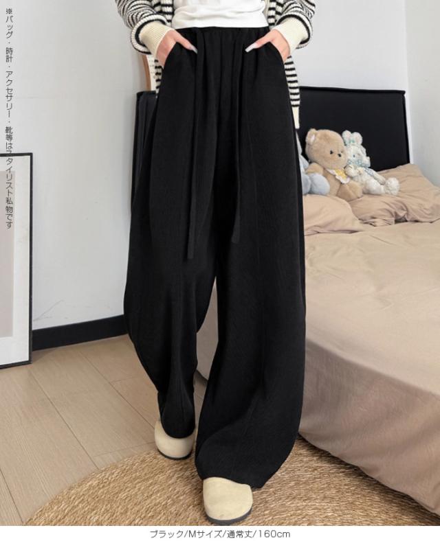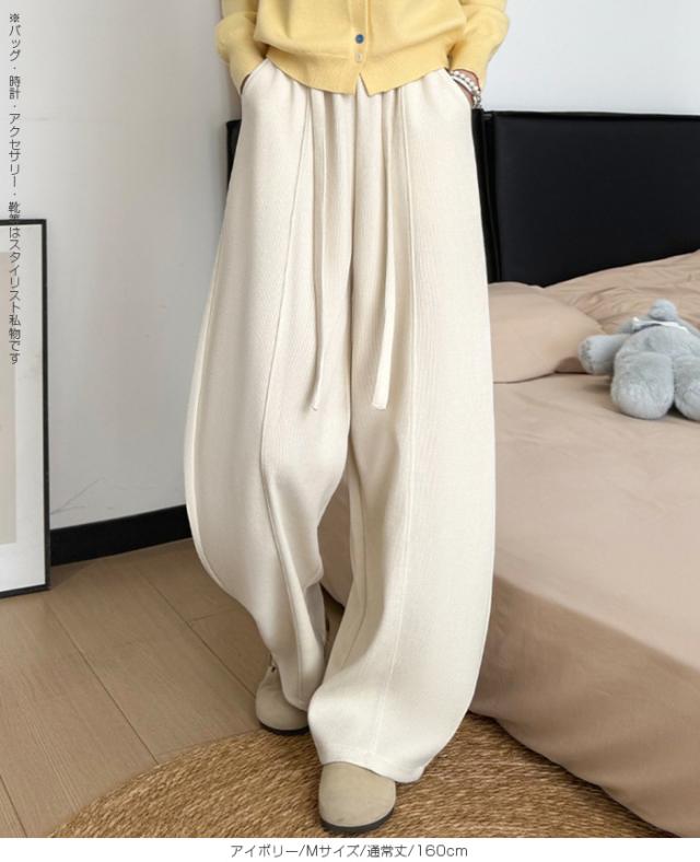 ウエストは総ゴム+紐仕様で、リラックス感のある快適な穿き心地。