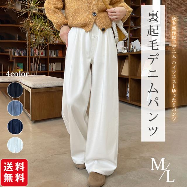 裏起毛 デニム 裏ボア ジーンズ ポケット付き パンツ デニムパンツ レディース ワイドパンツ ワイド 体型カバー 脚長効果 動きやすい ジーパン ボトムス ストレート ゆったり ハイウエスト ストレッチ ハイライズ 暖かい 秋 冬