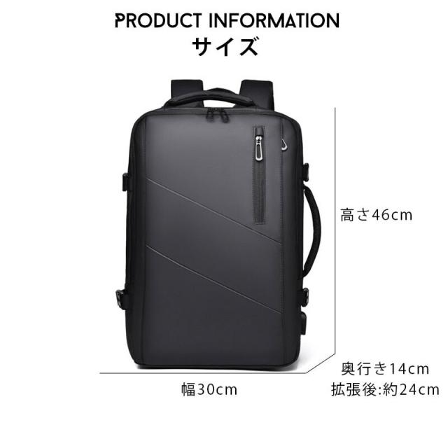 マチ拡張前、リュックの厚みはわずか14cmなので取り回しやすく、日常の通勤にぴったりでした。拡張後、合計約30Lの貯蔵スペースと分倉設計は、1泊2日の出張に必要なすべてのものを収容できます。通勤、出張、通学、旅行など様々な場合に合わせて利用できます。