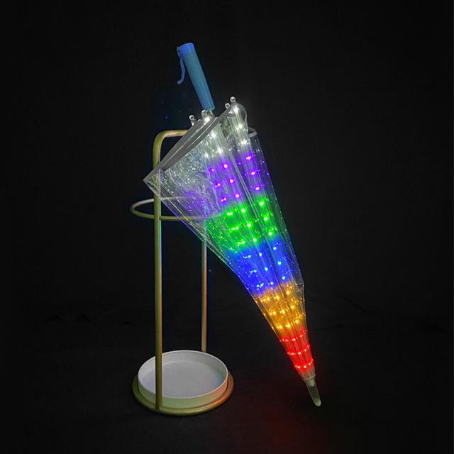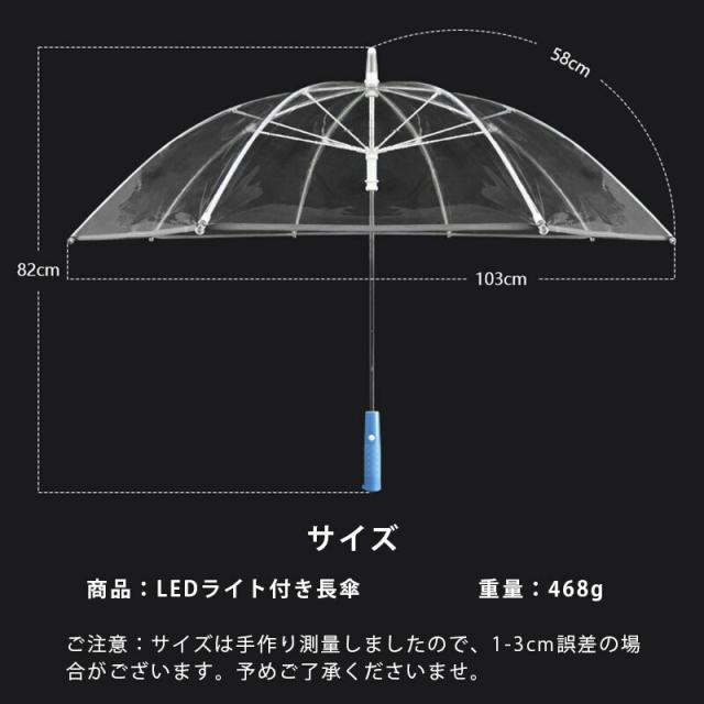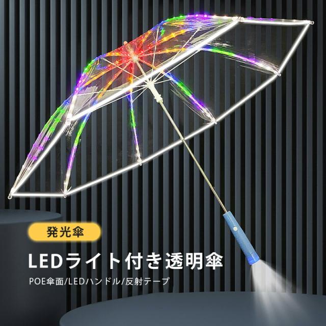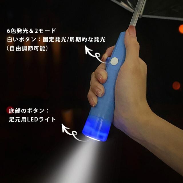 商品:傘 長傘 雨傘 光る傘 LEDライト付き 電池式 お子様 男女兼用 フラッシュライト 6色に光る 通勤 通学 LED傘 夜道も安心 防災 照明 材質:POE、軽量グラスファイバー
