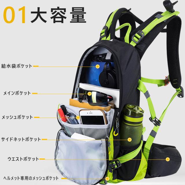 送料無料 サイクリングリュック 20L 超軽量 自転車バックパック 防水ナイロン 豊かなポケット バックパック リュック アウトドア ジョギング スポーツバッグ 反射ストラップ付き 登山 マラソン ヘルメット ホルダー付き 遠足 ウォーキングバッグ
