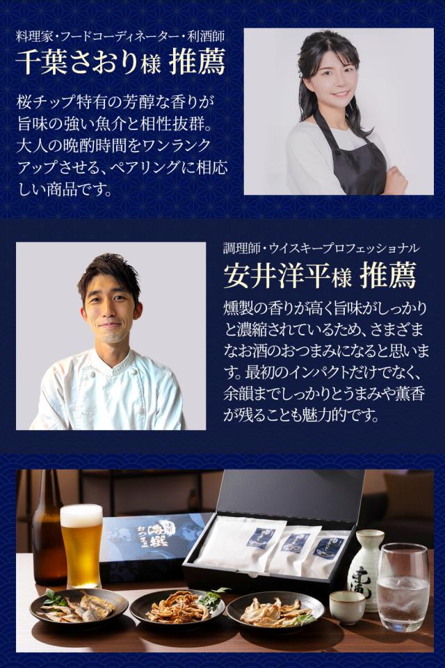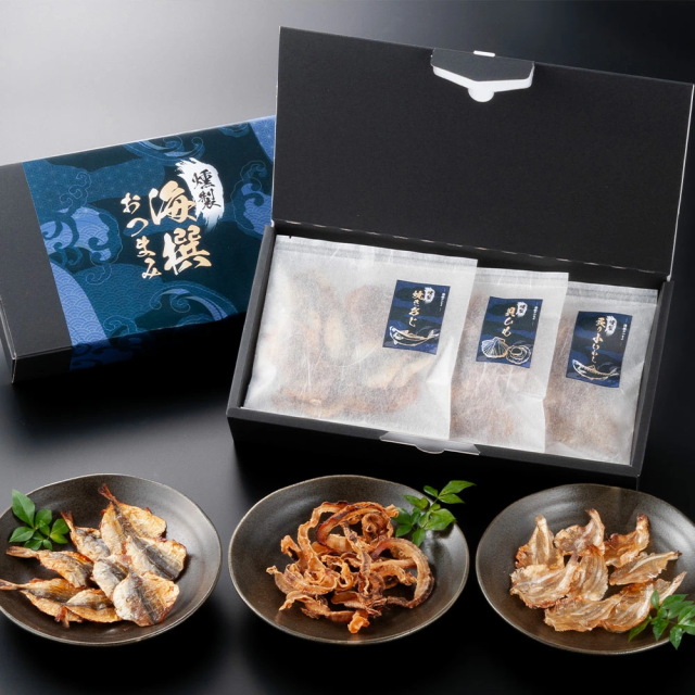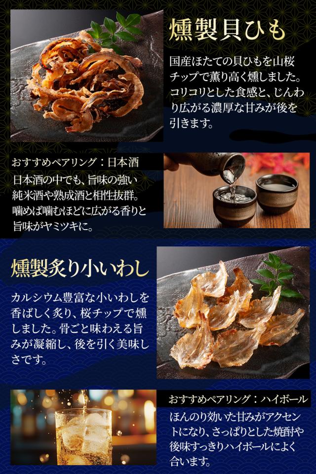 海のごちそう(貝ひも、焼きあじ、炙り小いわし)を、薫り高い国産山桜チップの燻製で贅沢に仕上げた、おつまみ3種セット。