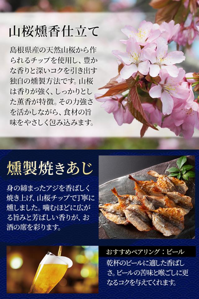 身の締まったアジを香ばしく焼き上げ、桜チップで丁寧に燻しました。