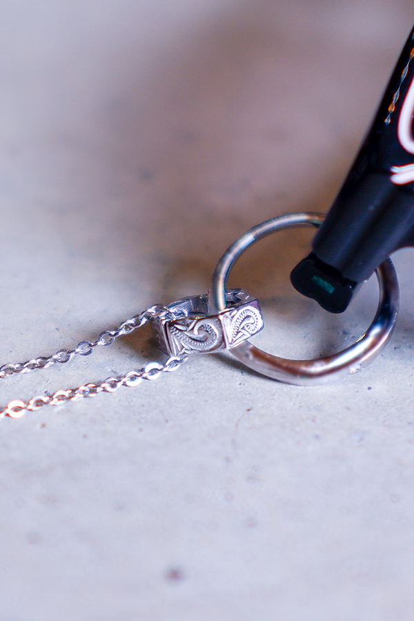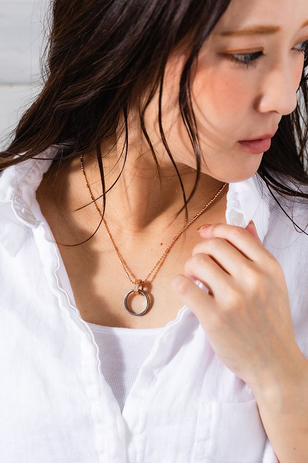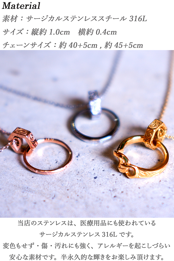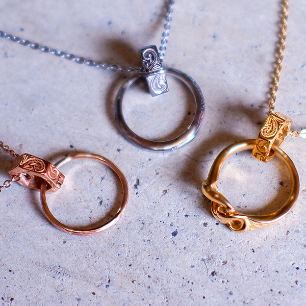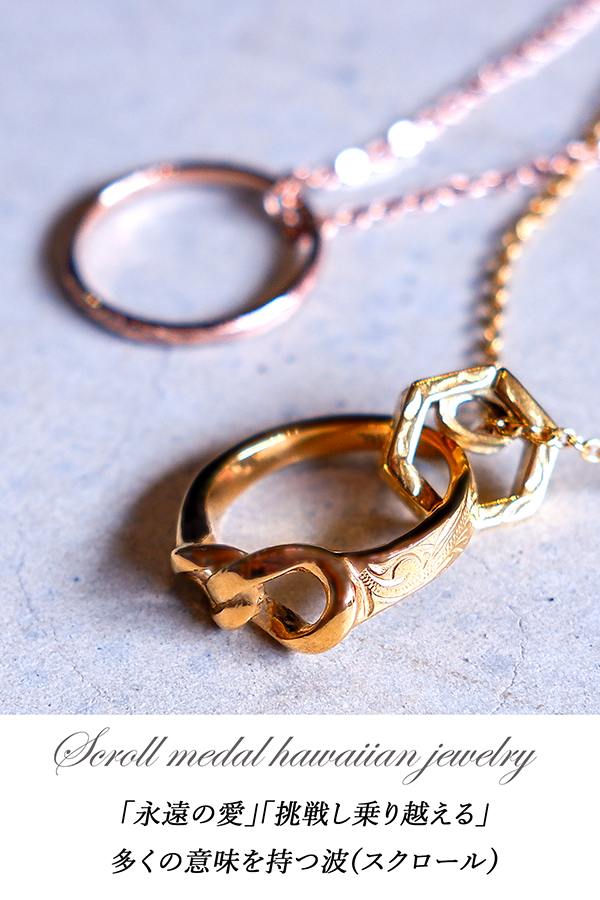 幸せを運ぶスクロールの模様がデザインされたサークルホルダーネックレス。