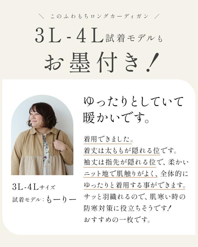 - 写真通りのベージュで素敵な色味です。普段3Lサイズの服を着ますが、問題なく羽織れました。肉は全く拾わないのでムチムチ感もなくいい感じです。自分の身長(160cm)だと若干丈が短く感じますが、これはこれ...