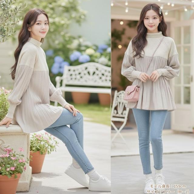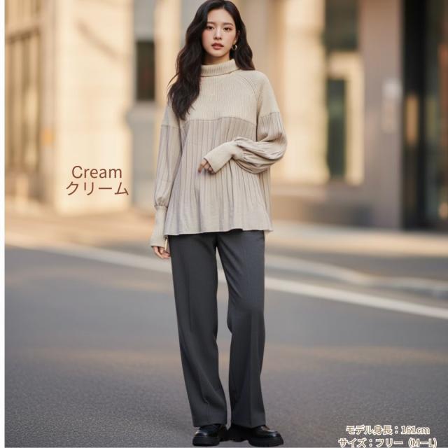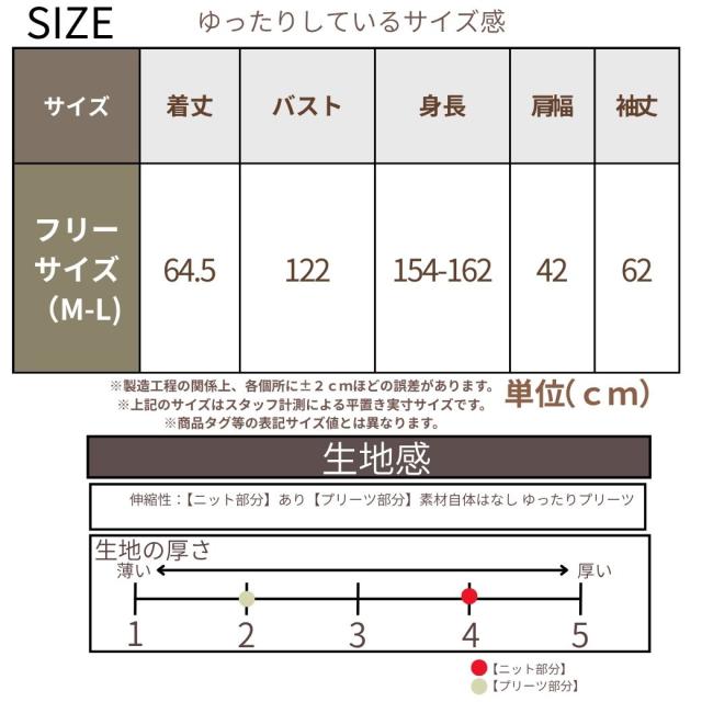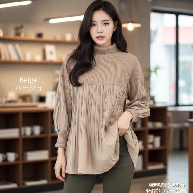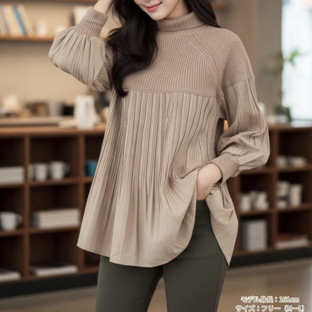 【サイズ】 ゆったりフリーサイズ着丈64.5 バスト122 身長154-162 肩幅42 袖丈62(単位:cm) 【注意書き】製造工程の関係上、各個所に±2ほどの誤差がある場合があります。 上記のサイズはスタッフ計測による平置き実寸サイズです。商品タグ等の表記サイズ値とは異なります。 【素材】 アクリル100% 別布ポリエステル100% 【生地感】伸縮性:「ニット部分」にはあり。「プリーツ部分」の素材自体にはなし。ゆったりとしたプリーツです。生地の厚さ:5段階評価で示されており、1が「薄い」、5が「厚い」を表します。ニット部分の厚さは4。プリーツ部分の厚さは2。【特徴】 \異素材のコントラストで魅せる、大人のためのハイネックチュニック/【1. 上品さとトレンドを両立するデザイン】今季注目の異素材切り替えデザインが、一枚でサマになる上品なスタイルを完成させます。上半身はふっくらとしたリブニット素材を使用し、保温性と柔らかな肌触りを追求。顔まわりをすっきり見せるハイネック仕様で、暖かさと小顔効果を両立しました。身頃から裾にかけては、繊細な縦ラインのプリーツシフォンが軽やかに揺れ、女性らしさを引き立てます。長めの丈感が気になるヒップやお腹周りをしっかりと体型カバーしてくれるため、30代、40代、50代、60代の大人女性におすすめです。【2. 毎日着たい、ストレスフリーな着心地】ゆったりとしたオーバーサイズのシルエットは、締め付け感なくリラックスして着用できます。長袖の袖口はリブ仕様で暖かさを逃さず、水仕事の際などには袖まくりもしやすい実用性も兼ね備えています。シンプルながらも着映えするデザインなので、通勤、オフィスなどのきれいめスタイルから、カジュアルなお出かけまで幅広く活躍します。【3. ギフト・プレゼントにも最適】ベージュ、アイボリーの淡いニュアンスカラーは、着回しが効きやすく、母やお母さんへの誕生日、敬老の日、クリスマスなどのプレゼント・ギフトとしても大変喜ばれるアイテムです。洗濯しやすくお手入れも簡単なのです。