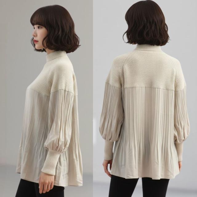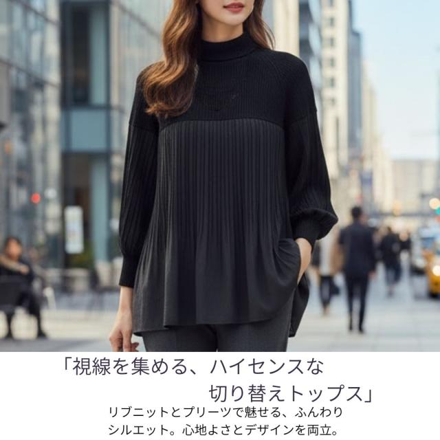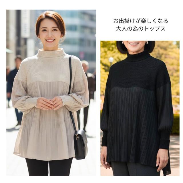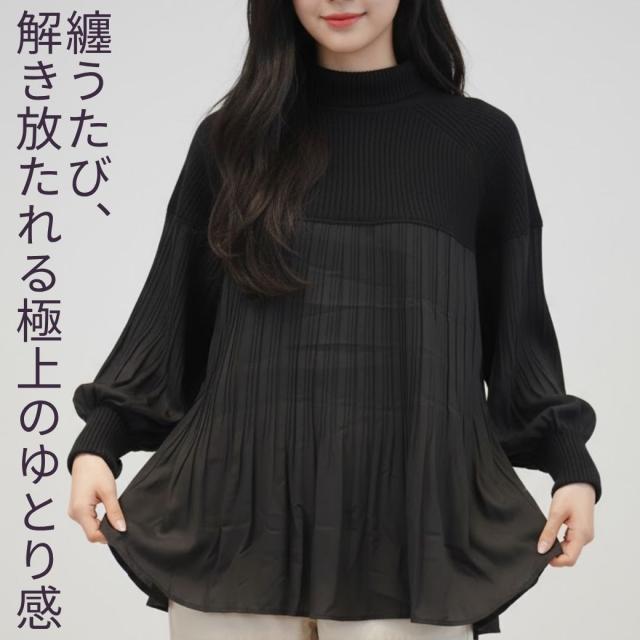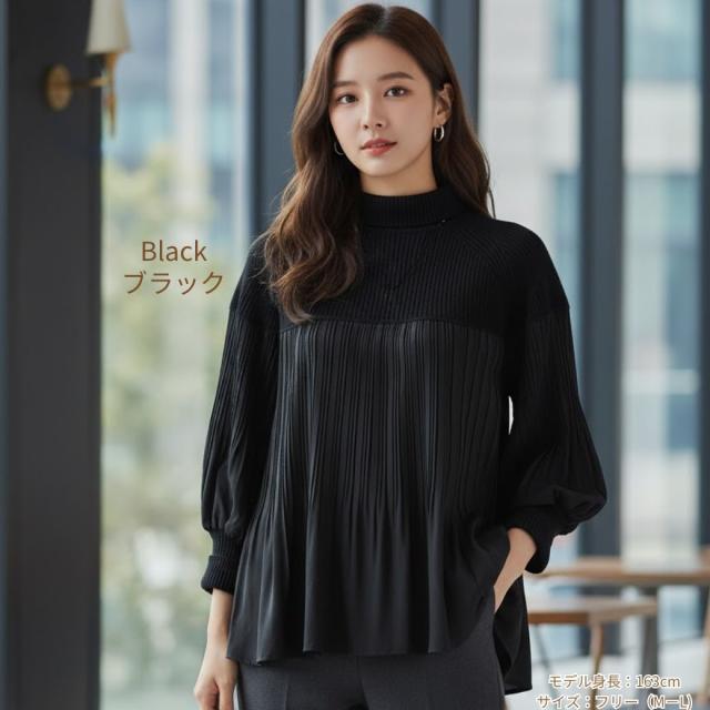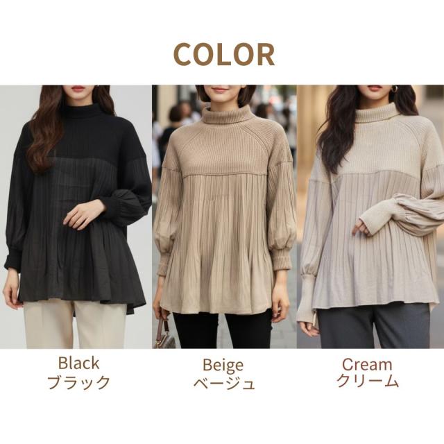 360度大人可愛い。ぽわん袖 ニット × プリーツ ドッキング トップス プルオーバー タートルニット レディース セーター チュニック ブラウス 長袖 ボリュームスリーブ タートル 体型カバー お尻が隠れる きれいめ 黒 ブラック 冬 秋