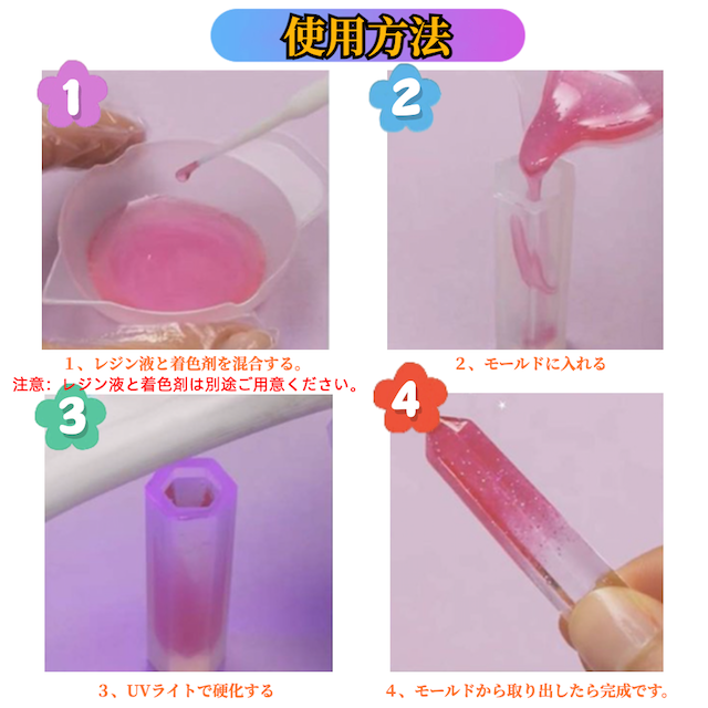 こちらのシリコンモールドはUVレジンやエポキシ樹脂、樹脂粘土などのさまざまな素材に適応しています。シリコン製なので型抜きもしやすいです。
