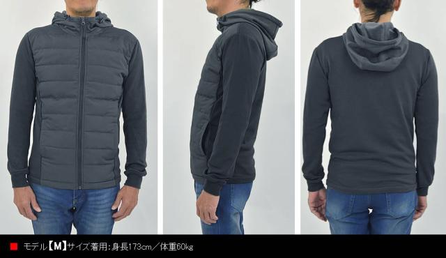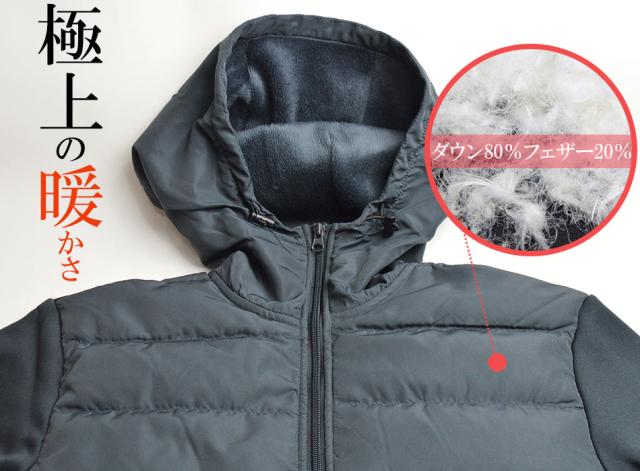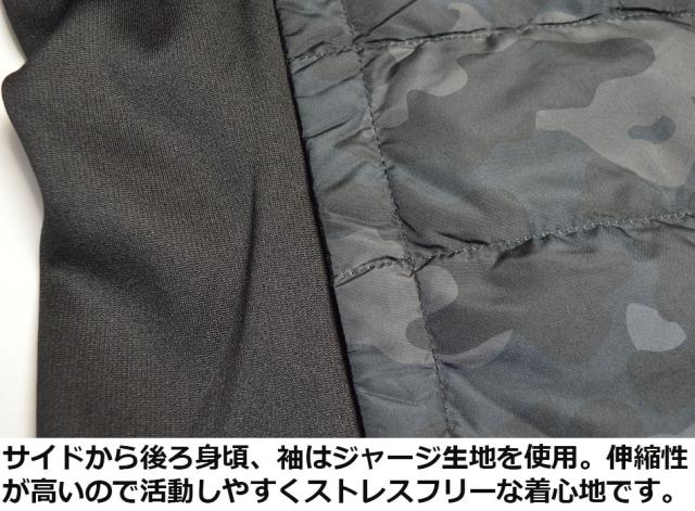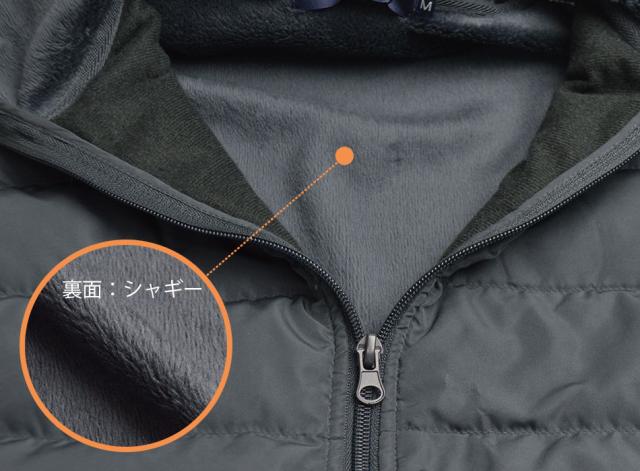 ■前身頃にリアルダウンを詰め込み、後身頃と袖の表面はストレッチ性のあるジャージ素材、裏面は保温性に優れた暖かな裏シャギー仕立てです。