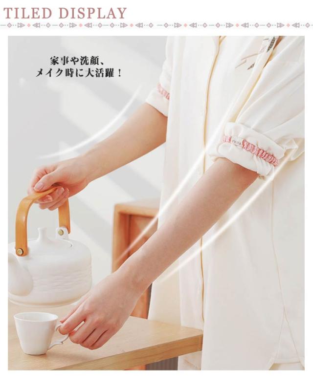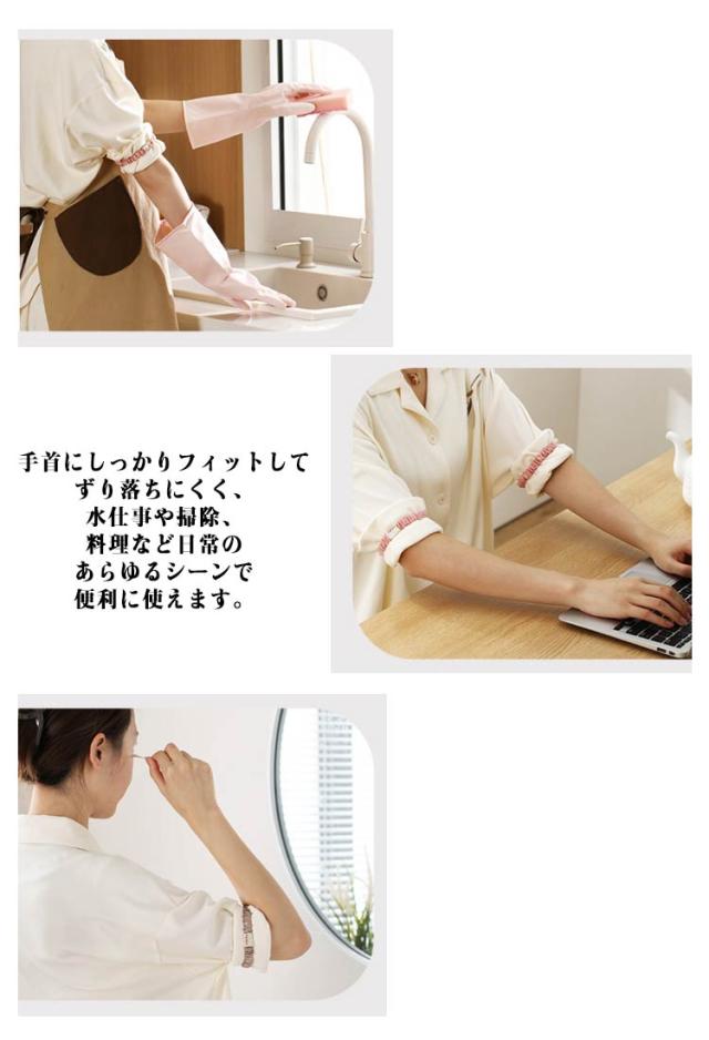 | 家事や洗顔、メイク時に大活躍!袖の濡れや汚れを防ぐ可愛いアームバンドです。 柔らかく伸縮性のある素材で、長時間の使用でも快適♪ 手首にしっかりフィットしてずり落ちにくく、水仕事や掃除、料理など日常のあらゆるシーンで便利に使えます。 キッチンでお皿洗いをする時など、洋服の袖口を上にまくりたい時や留めたい時に便利◎ | |