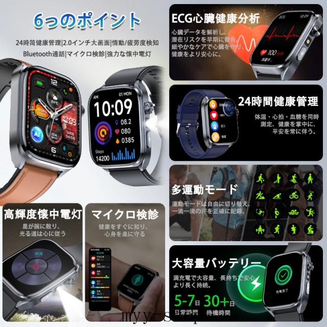 即日発送 スマートウォッチ 懐中電灯 血糖値 血圧 心電図測定 心拍数 血中酸素濃度 HRV分析 体質/BMI測定 睡眠管理 月経周期トラッキング 呼吸訓練 ストレス監視 体温検知 リモートケア 通話機能 IP68防水 着信通知 父の日 母の日 誕生日 プレゼント